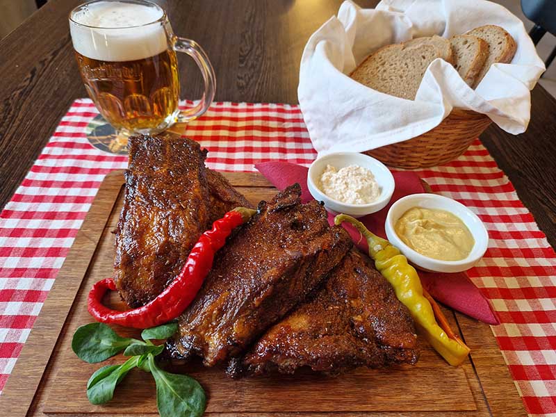 Žebra marinovaná s křenem a hořčicí s domácím chlebíčkem a půl litrem pivka dle výběru pro 1 osobu 450 Kč